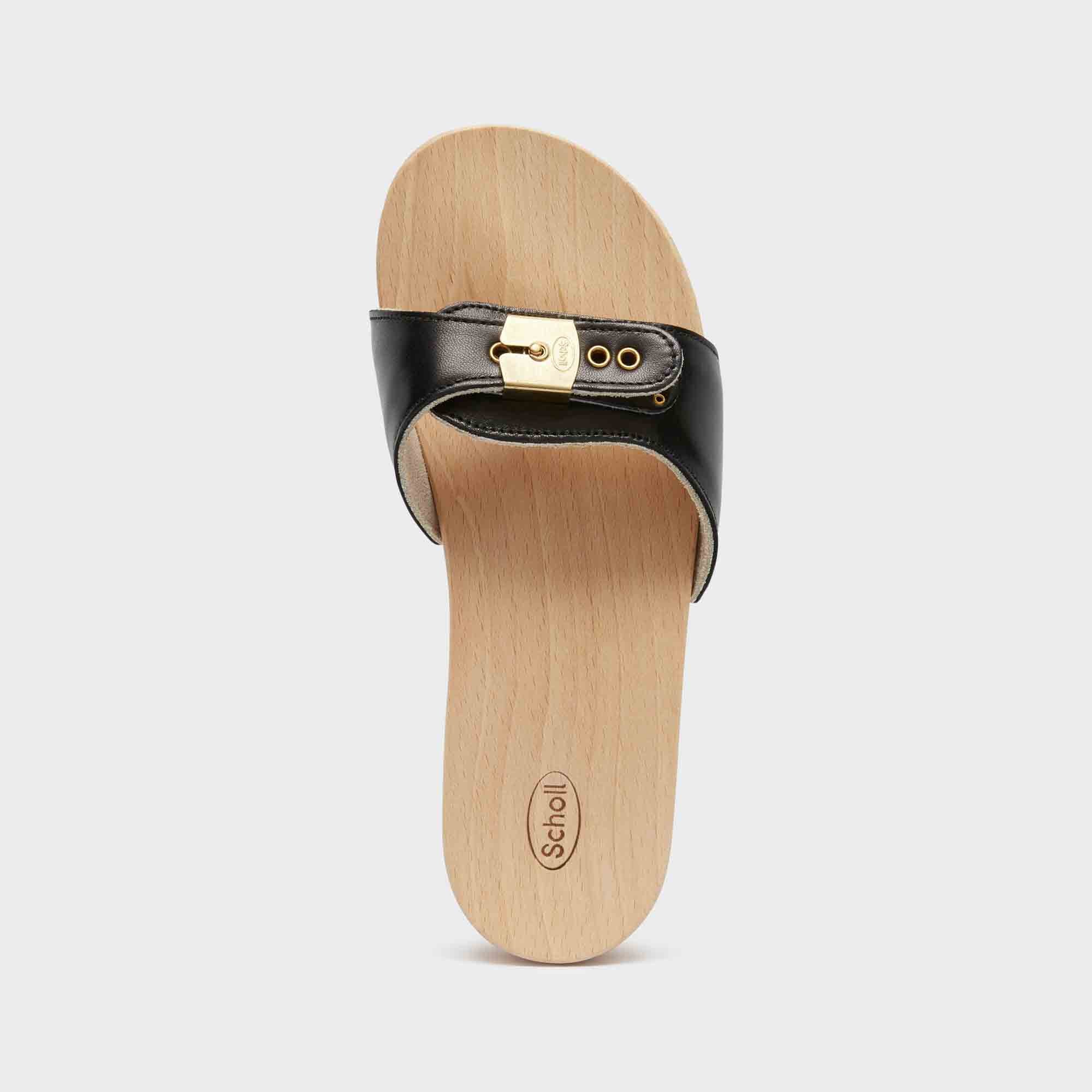 Pescura is the original wooden mule by Scholl, a true 1970s icon and must-have to give a retro touch to any look. Designed and made entirely in Italy with high-quality materials such as the pure beechwood base and the fully adjustable leather upper and the soft wool lining. Made in Italy